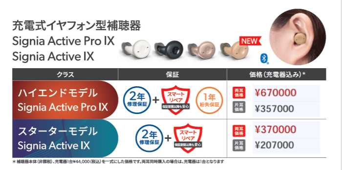 Signia Active IXの価格はオープン価格です。大阪補聴器センター吹田店では推奨価格は以下の通りです。
