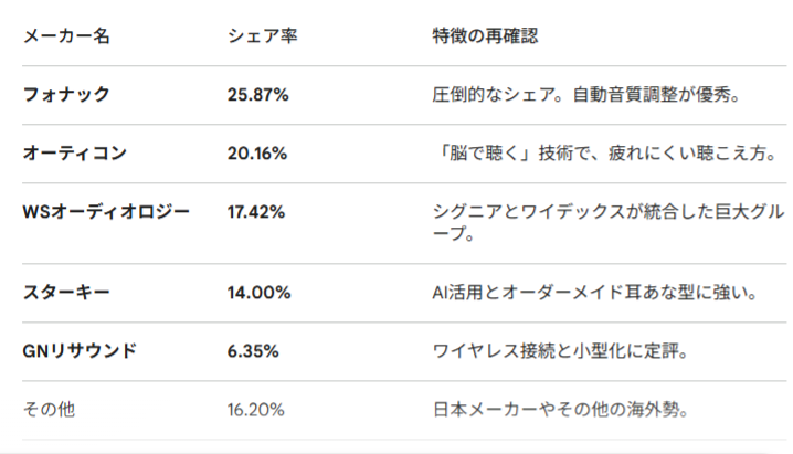 これらのメーカーは、それぞれ特徴的な技術や製品ラインナップを持ち、多くの聴力に関するニーズに対応しています。