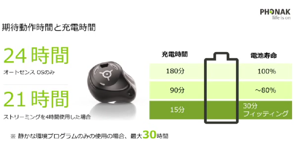 小型の充電式オーダーメイド補聴器ですが、フル充電で最大 約34時間 の使用が可能です。