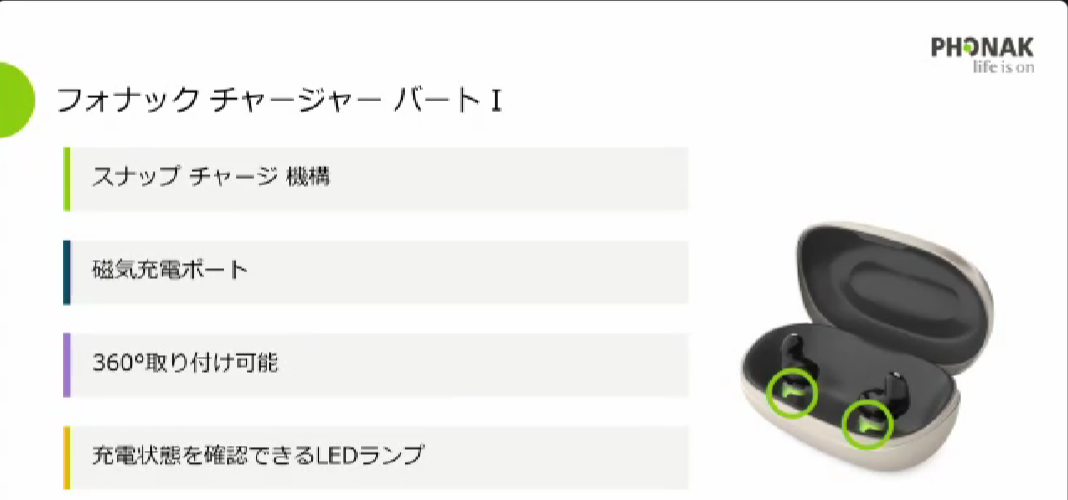 従来の電池タイプではなく、充電式を採用。充電器は“スナップチャージ(Snap & Charge)システム”と呼ばれる方式で、磁石などで装着を安定させて充電できるようになっています 。どの方向からでも使用可能な充電ポストで、補聴器の向きを気にする必要がありません。まさにワイヤレスイヤホンのように簡単に充電できます。